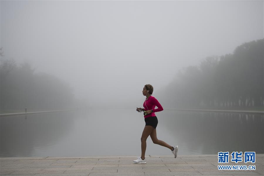 10月22日,在美国首都华盛顿,一名女子从浓雾笼罩的林肯纪念堂倒影池前跑过。 当日,华盛顿出现浓雾天气,能见度较低。 新华社记者 刘杰 摄
