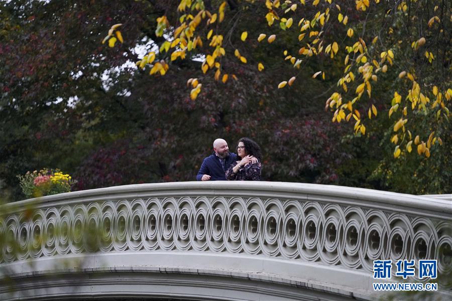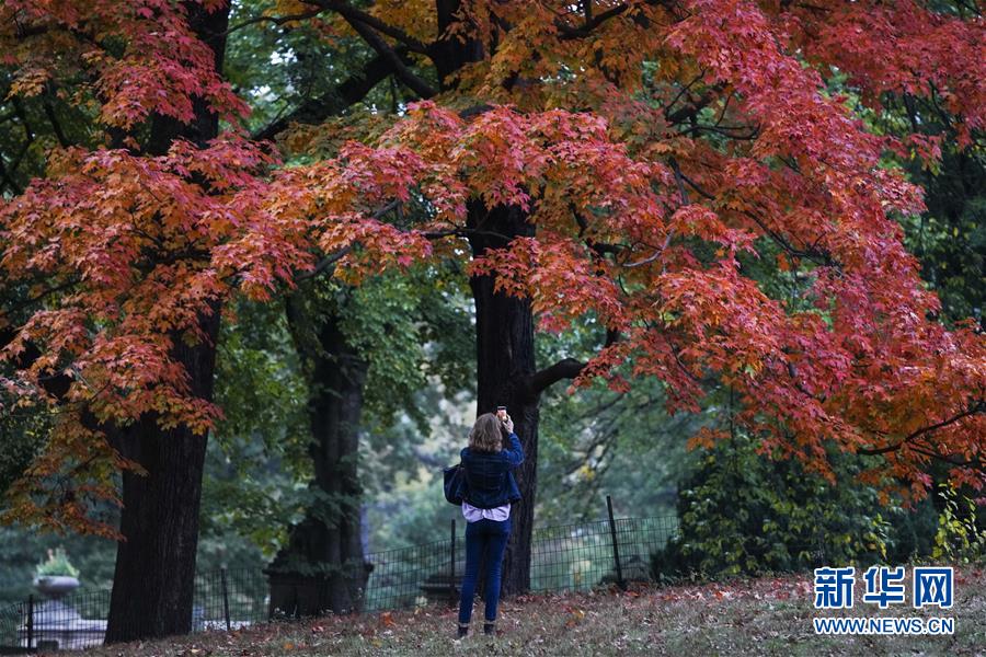 10月22日,游客在美国纽约中央公园内欣赏秋色。 随着天气转凉,纽约迎来迷人秋色。 新华社记者 王迎 摄