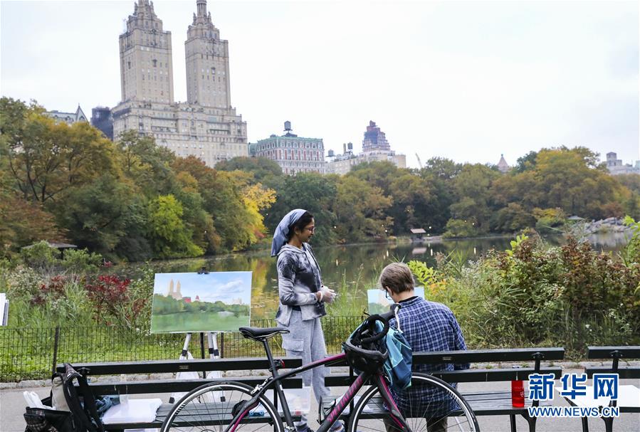 10月22日,人们在美国纽约中央公园内写生。新华社记者 王迎 摄