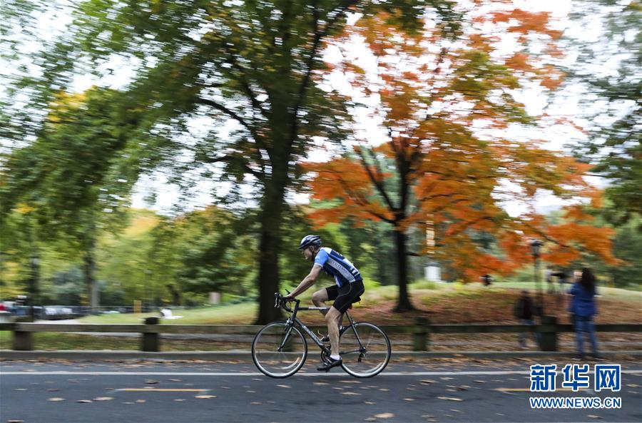 10月22日,游客在美国纽约中央公园内骑车。新华社记者 王迎 摄