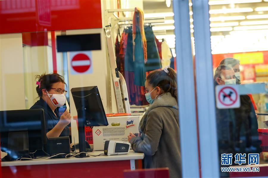 10月24日,在比利时布鲁塞尔的一家商店,戴口罩的顾客等待结账。新华社记者 张铖 摄