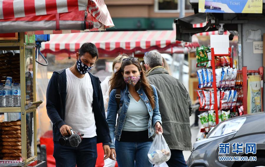 10月21日,在土耳其伊斯坦布尔,人们戴着口罩出行。 土耳其卫生部官网显示,该国当天新增确诊1894例,累计确诊351413例;新增死亡74例,累计死亡9445例;累计治愈306939例。 新华社记者徐速绘摄