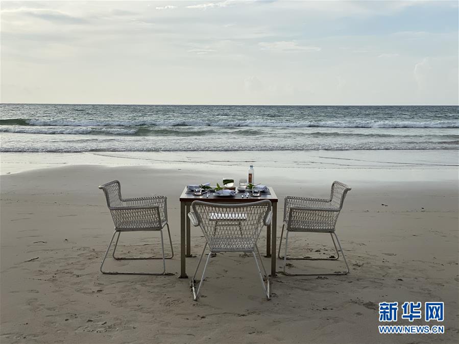 10月21日,泰国普吉一间酒店在芭东海滩上布置拍摄宣传片所使用的餐桌。 新华社记者 张可任 摄