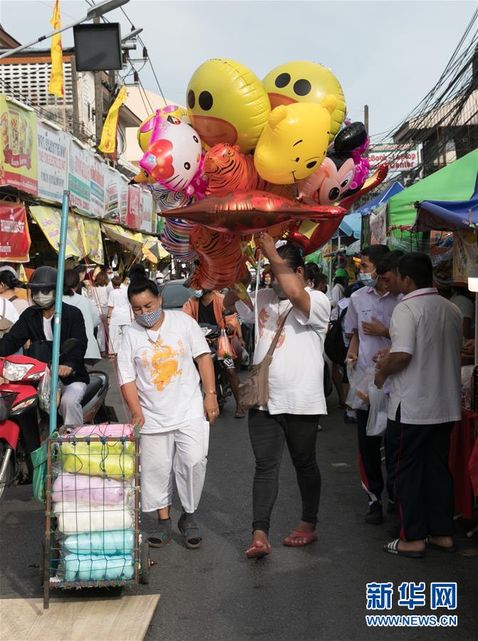 10月20日,一名商贩在泰国普吉镇的集市上兜售气球。 新华社记者 张可任 摄