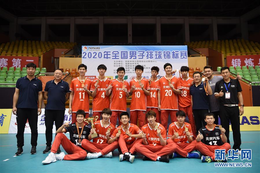 10月28日,获得冠军的北京队在颁奖仪式后合影。 当日,在福建省漳州体育训练基地举行的2020年全国男排锦标赛决赛中,北京队以3比1战胜浙江队,获得冠军。 新华社记者 姜克红 摄 |