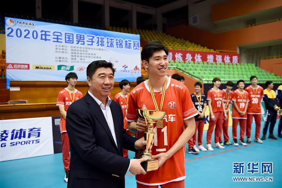10月28日,国家体育总局排球运动管理中心主任李全强(左)为北京队颁发冠军奖杯。 当日,在福建省漳州体育训练基地举行的2020年全国男排锦标赛决赛中,北京队以3比1战胜浙江队,获得冠军。 新华社记者 姜克红 摄