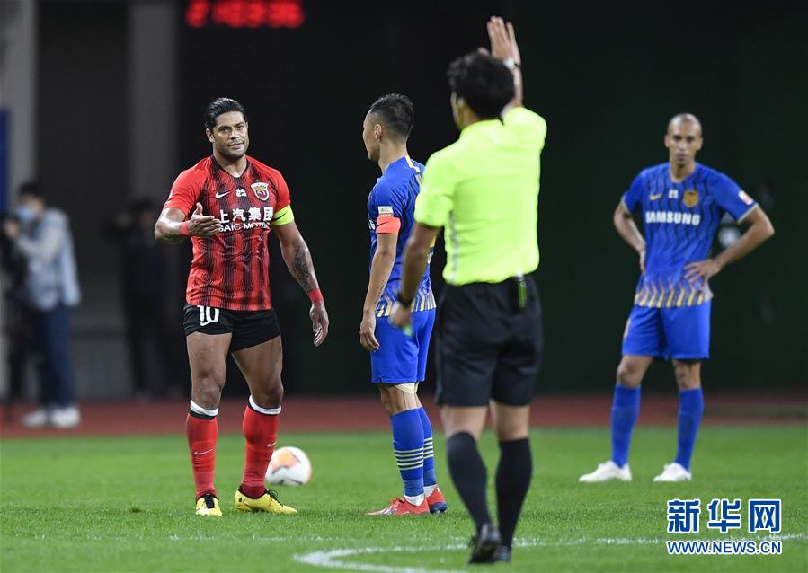 10月29日,上海上港队球员胡尔克(左一)不满主裁判金希坤的判罚。 当日,在2020赛季中国足球协会超级联赛(苏州赛区)第17轮比赛中,江苏苏宁易购队以1比1战平上海上港队。 新华社记者 许畅 摄