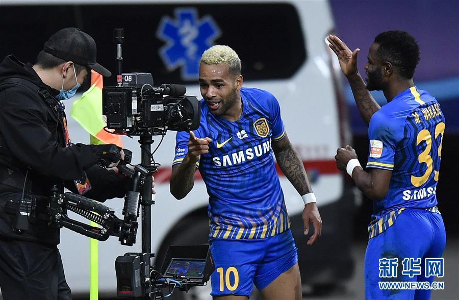 10月29日,江苏苏宁易购队球员特谢拉(中)在比赛中庆祝进球。 当日,在2020赛季中国足球协会超级联赛(苏州赛区)第17轮比赛中,江苏苏宁易购队以1比1战平上海上港队。 新华社记者 许畅 摄 |