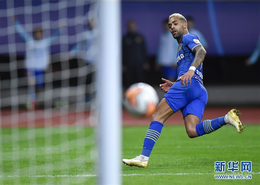 10月29日,江苏苏宁易购队球员特谢拉在比赛中射门得分。 当日,在2020赛季中国足球协会超级联赛(苏州赛区)第17轮比赛中,江苏苏宁易购队以1比1战平上海上港队。 新华社记者 许畅 摄