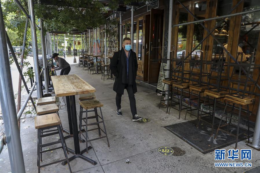 10月30日,在美国纽约,行人从一家酒吧的户外就餐区走过。 美国约翰斯·霍普金斯大学30日发布的新冠疫情最新统计数据显示,美国累计确诊病例超过900万例。数据显示,美国累计确诊病例从800万例升至900万例仅用时14天。 新华社记者 王迎 摄