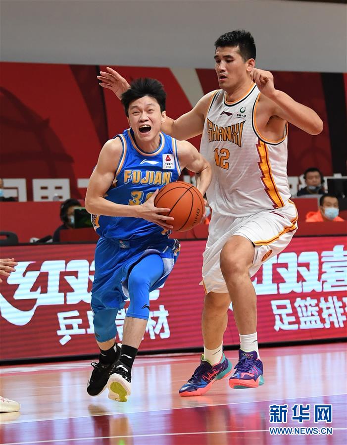 10月31日,福建豹发力队球员徐铭智(左)在比赛中突破防守。 当日,在浙江诸暨举行的2020-2021中国男子篮球职业联赛(CBA)第一阶段第七轮比赛中,山西汾酒股份队以102比85战胜福建豹发力队。 新华社记者 沙达提 摄