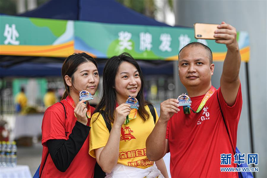 10月31日,参加健步走的群众在活动后合影留念。 当日,2020海南万人健步大会在海口举行,逾万名群众参与其中。 新华社记者 蒲晓旭 摄