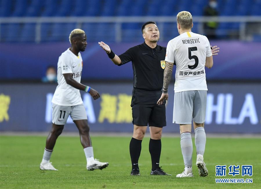 10月31日,河北华夏幸福队球员梅米舍维奇(右)在比赛中与主裁判石祯禄交流。 当日,在2020赛季中国足球协会超级联赛(苏州赛区)第18轮比赛中,山东鲁能泰山队与河北华夏幸福队90分钟内战成2比2。最终通过加时赛,山东鲁能泰山队以6比3战胜河北华夏幸福队,从而以两回合总比分8比5晋级第五名争夺赛。 新华社记者 许畅 摄