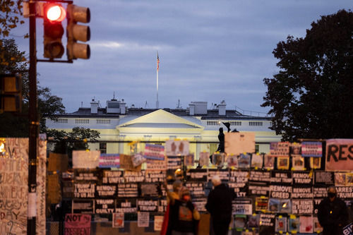 10月31日傍晚在美国华盛顿拍摄的白宫,铁栅栏上挂满抗议标语。新华社记者刘杰摄