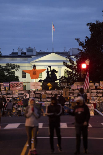 新华社记者在首都华盛顿看到,在白宫北面铁栅栏上,挂满各种抗议标语。夜幕降临后,一些抗议者手持喇叭和抗议标语在白宫外行进。