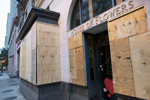 10月31日,在美国华盛顿,白宫附近的一家花店用木板加固了门窗。新华社记者刘杰摄