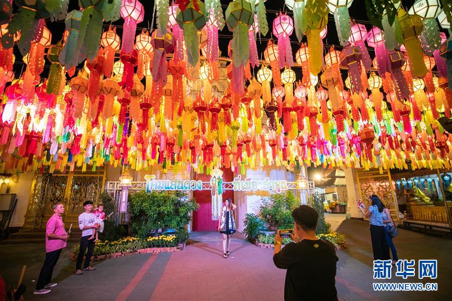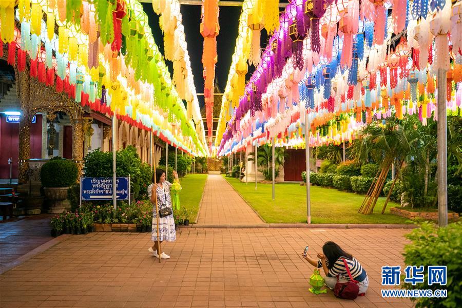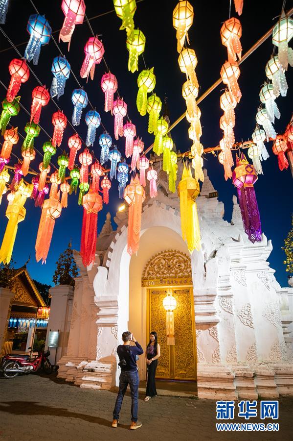 11月1日,参观者在泰国南奔府哈利奔猜寺的灯会上拍照。 近日,泰国南奔府在哈利奔猜寺举办盛大灯会,十万盏灯笼将哈利奔猜寺点缀成了七彩缤纷的灯笼“海洋”。人们来到这里,将美好的祝愿写在灯笼上,并高高挂起,为新的一年祈福。 新华社记者 张可任 摄