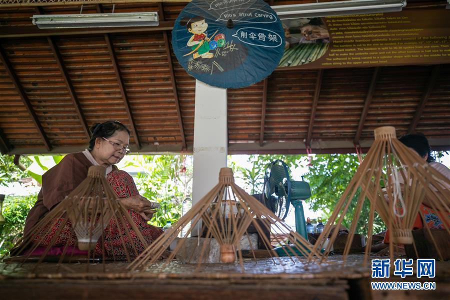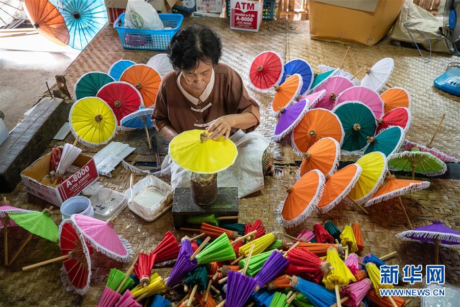 11月1日,工匠在泰国清迈市博桑伞村的纸伞制作中心粘贴伞面。 位于泰国清迈市中心以东9公里的博桑伞村,以生产纸伞而闻名。其伞柄、伞骨、伞面都由当地极富经验的伞匠精工打造而成,伞面的图案由手工绘制。大小各异、五颜六色的纸伞置于草地上晾晒,待颜料被风干,一把独一无二的手绘油纸伞就完成了。 新华社记者 张可任 摄