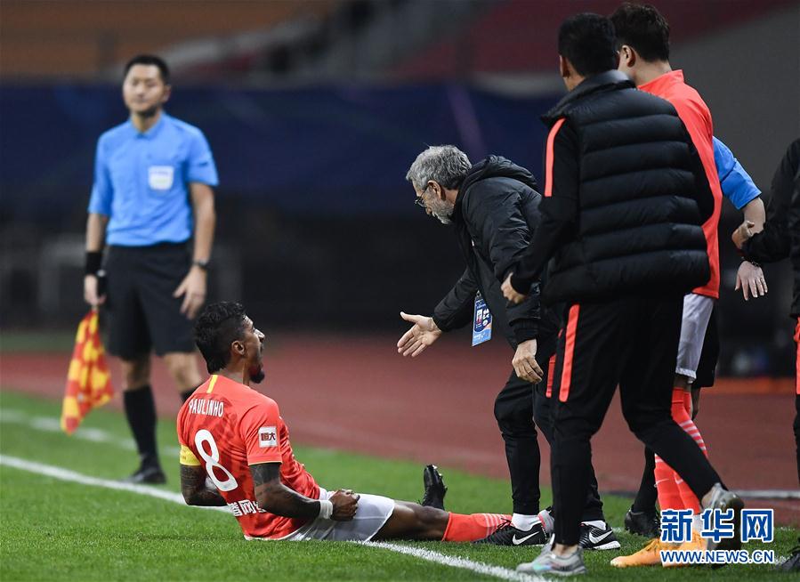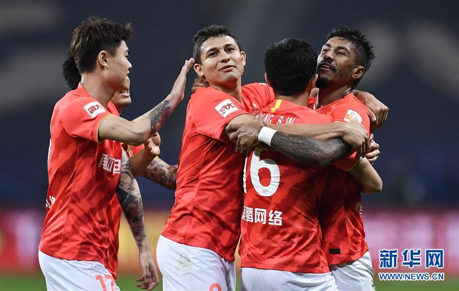 11月2日,广州恒大淘宝队球员保利尼奥(右)在比赛中进球后与队友庆祝。 当日,在2020赛季中国足球协会超级联赛(苏州赛区)第18轮比赛中,广州恒大淘宝队以3比1战胜北京中赫国安队,从而以两回合总比分3比1晋级决赛。 新华社记者 许畅 摄