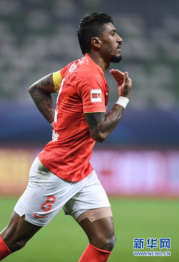 11月2日,广州恒大淘宝队球员保利尼奥在比赛中庆祝进球。 当日,在2020赛季中国足球协会超级联赛(苏州赛区)第18轮比赛中,广州恒大淘宝队以3比1战胜北京中赫国安队,从而以两回合总比分3比1晋级决赛。 新华社记者 许畅 摄