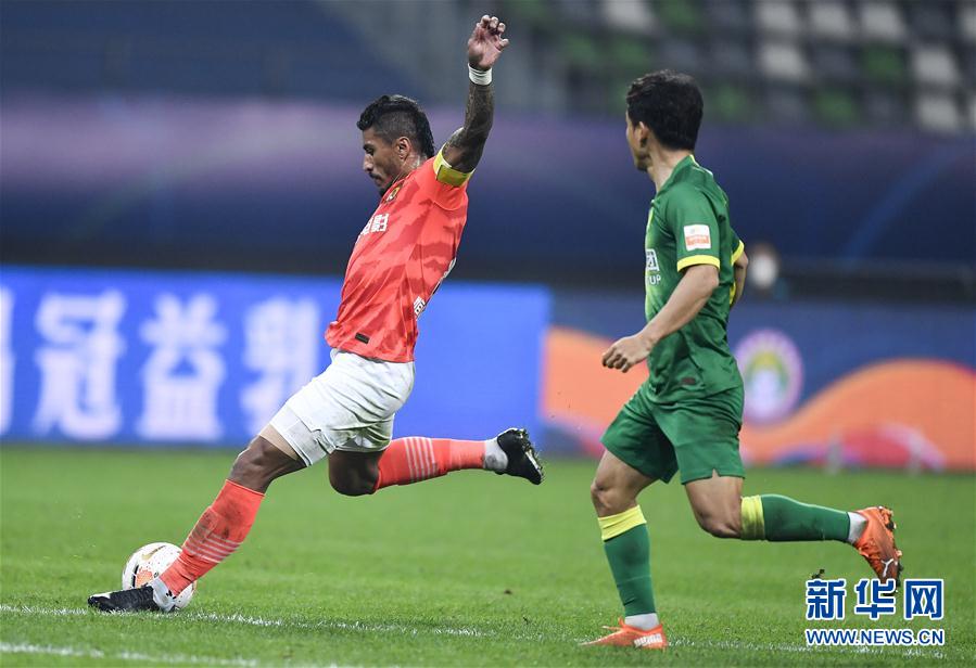 11月2日,广州恒大淘宝队球员保利尼奥(右)与北京中赫国安队球员王刚在比赛中拼抢。 当日,在2020赛季中国足球协会超级联赛(苏州赛区)第18轮比赛中,广州恒大淘宝队以3比1战胜北京中赫国安队,从而以两回合总比分3比1晋级决赛。 新华社记者 许畅 摄