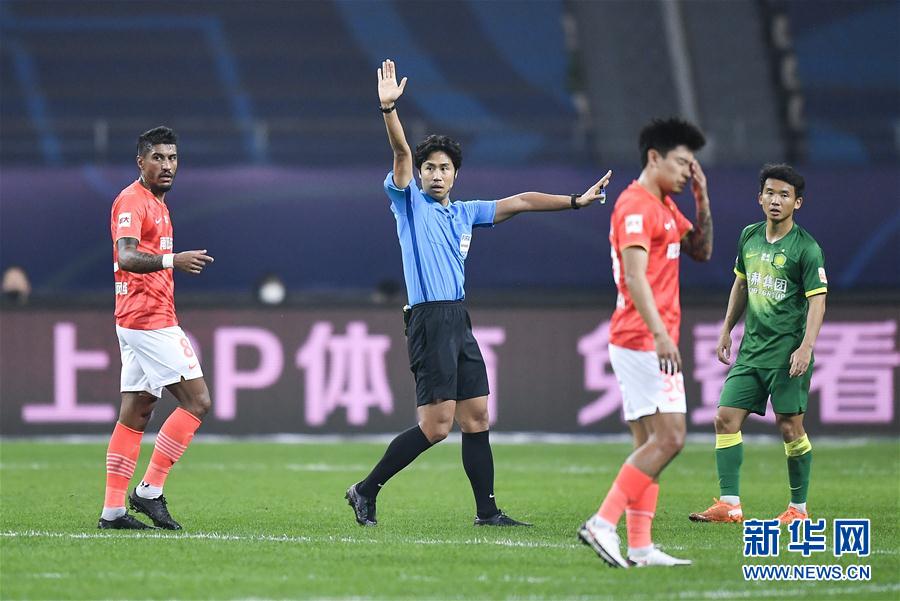 11月2日,主裁判金希坤(左二)在比赛中执裁。 当日,在2020赛季中国足球协会超级联赛(苏州赛区)第18轮比赛中,广州恒大淘宝队以3比1战胜北京中赫国安队,从而以两回合总比分3比1晋级决赛。 新华社记者 许畅 摄