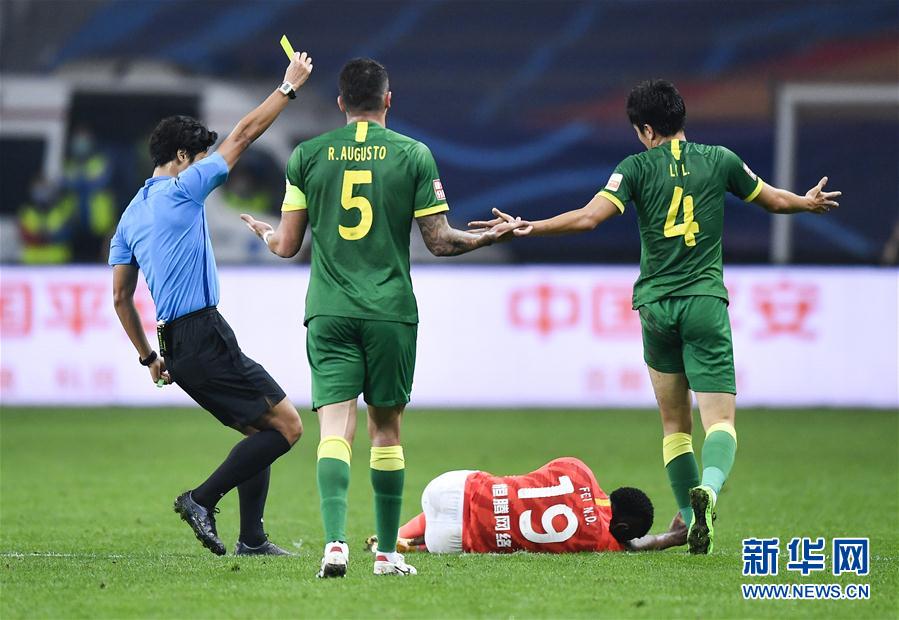 11月2日,主裁判金希坤(左一)向北京中赫国安队球员李磊(右一)出示黄牌。 当日,在2020赛季中国足球协会超级联赛(苏州赛区)第18轮比赛中,广州恒大淘宝队以3比1战胜北京中赫国安队,从而以两回合总比分3比1晋级决赛。 新华社记者 许畅 摄