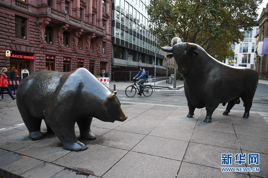 这是10月28日在德国法兰克福证券交易所外拍摄的“熊牛对峙”雕塑。 德国法兰克福股市DAX指数28日下跌503.06点,跌幅为4.17%,报收于11560.51点。 新华社记者逯阳摄