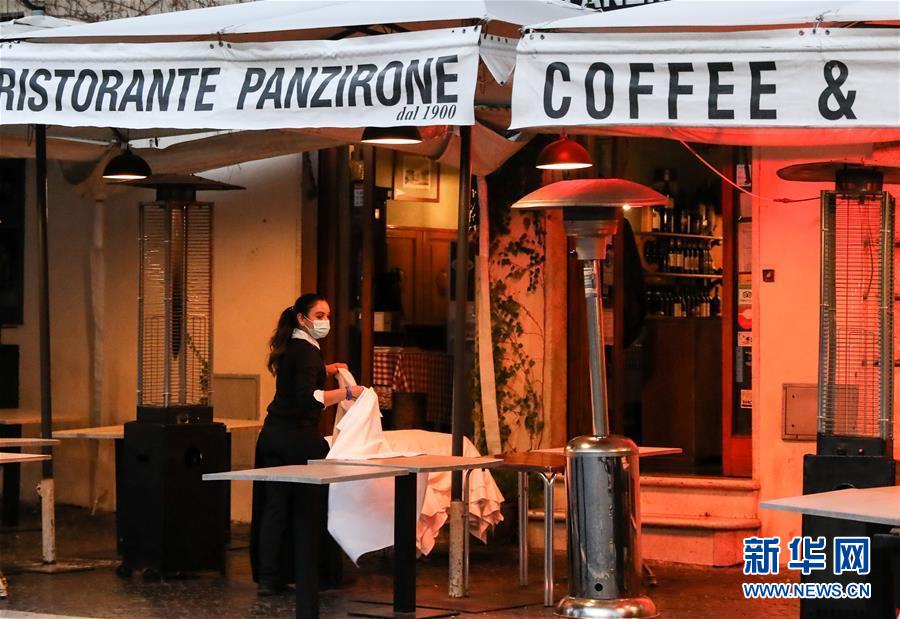 10月26日,意大利首都罗马纳沃纳广场上一家餐馆临近18时停止堂食服务。 意大利政府采取一系列新措施,进一步加强新冠疫情防控。自10月26日零时起至11月24日,意大利禁止酒吧、咖啡馆、餐厅、冰淇淋店等每天18时后继续提供堂食。 新华社记者 程婷婷 摄