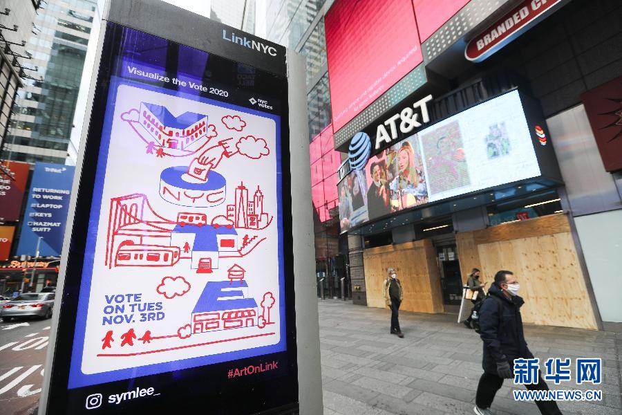 11月2日,行人经过美国纽约时报广场上鼓励投票的广告。 11月3日选举日临近,美国大选进入倒计时,纽约街头布置多处广告,鼓励人们参与投票。 新华社记者 王迎 摄