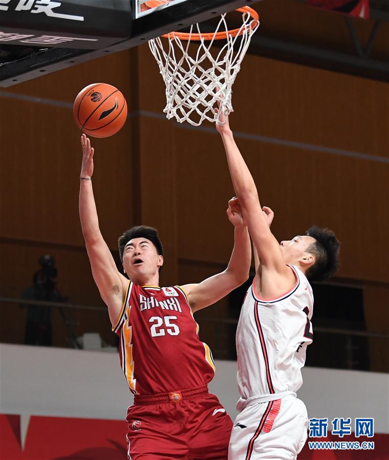 11月5日,山西汾酒股份队球员张涵钧(左)在比赛中上篮。 当日,在浙江诸暨举行的2020-2021赛季中国男子篮球职业联赛(CBA)第一阶段第九轮比赛中,广东东莞大益队以131比106战胜山西汾酒股份队。 新华社记者 沙达提 摄