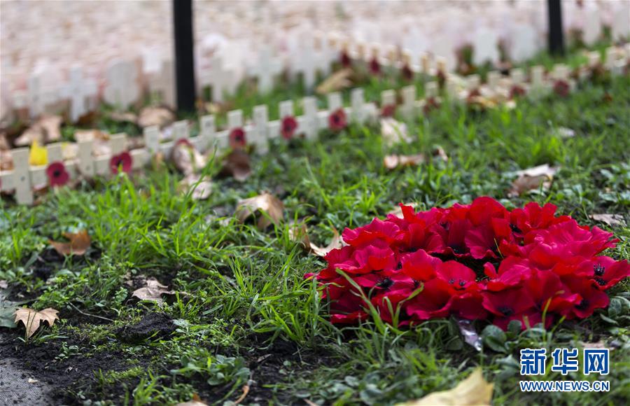 这是11月7日在英国伦敦拍摄的威斯敏斯特教堂外摆放的花环和“罂粟花十字架”。 英国伦敦威斯敏斯特教堂外的草坪摆放了众多“罂粟花十字架”,迎接即将到来的“阵亡将士纪念日”,纪念在第一次世界大战中阵亡的将士。11月11日是英联邦国家停战纪念日,也称“阵亡将士纪念日”。 新华社记者 韩岩 摄