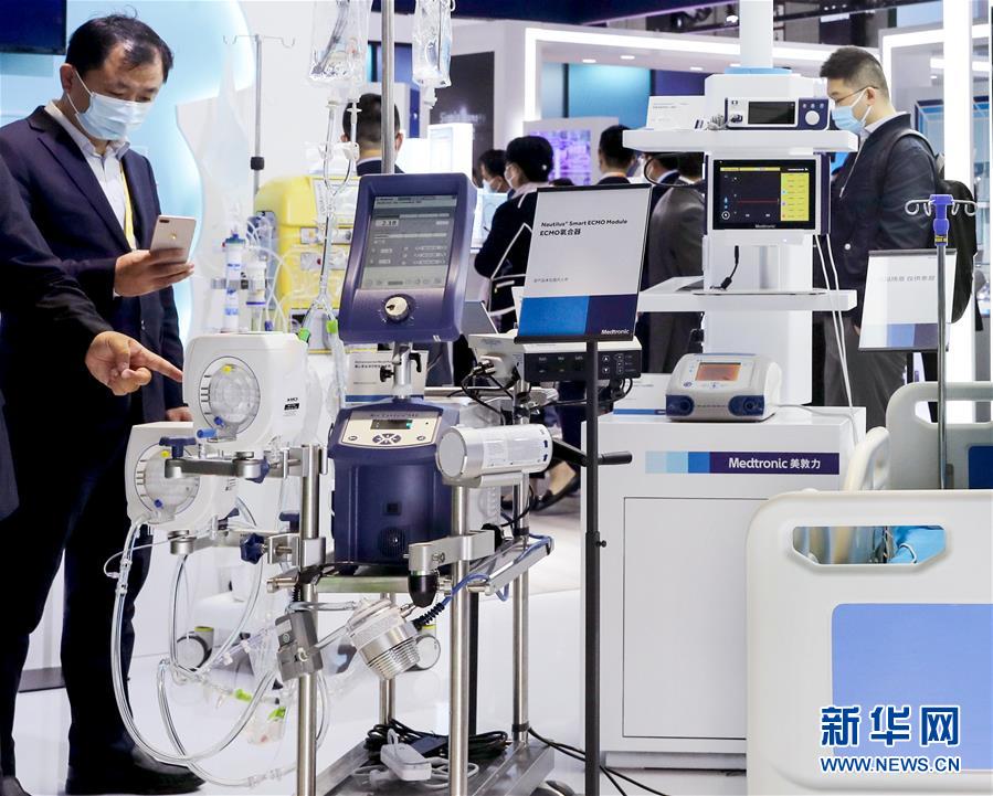 医疗器械及医药保健展区的美敦力展台展出新一代ECMO技术(11月5日摄)。新冠病毒疫苗、智慧无人疫苗接种舱、ECMO(体外膜肺氧合)、高度自动化的核酸检测系统……第三届中国国际进口博览会的各大参展商带来多款位于技术前沿的抗疫“神器”,全球抗疫新技术含金量十足,让人目不暇接。 新华社记者 刘颖 摄