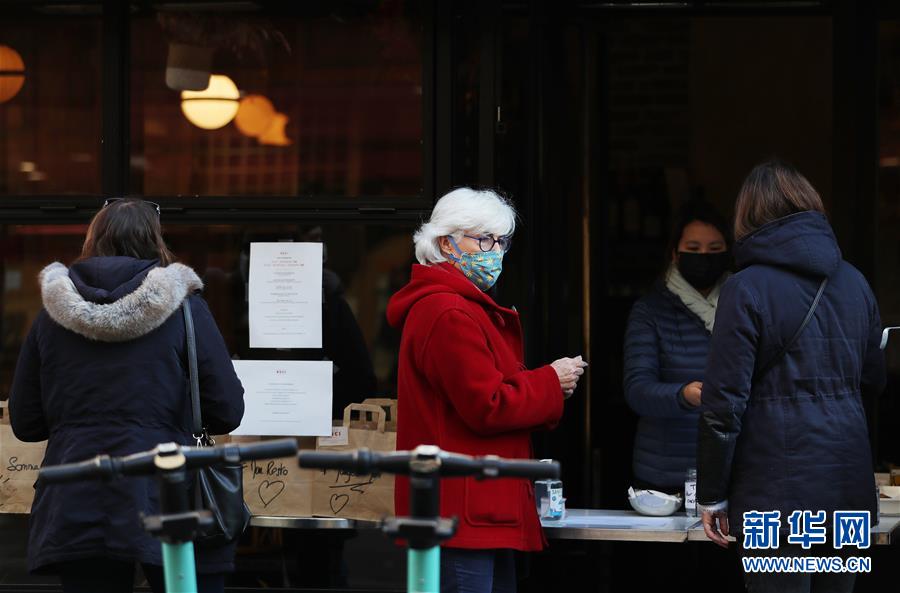 11月9日,人们在法国巴黎一家餐馆外等待取餐带走。 法国国民议会7日投票通过了延长“卫生紧急状态”的法案,“卫生紧急状态”将延长至2021年2月16日。 新华社记者 高静 摄