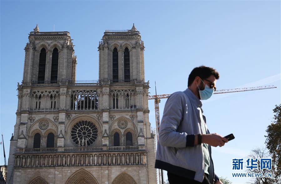 11月9日,在法国巴黎,一名男子从修复中的巴黎圣母院附近经过。 法国国民议会7日投票通过了延长“卫生紧急状态”的法案,“卫生紧急状态”将延长至2021年2月16日。 新华社记者 高静 摄