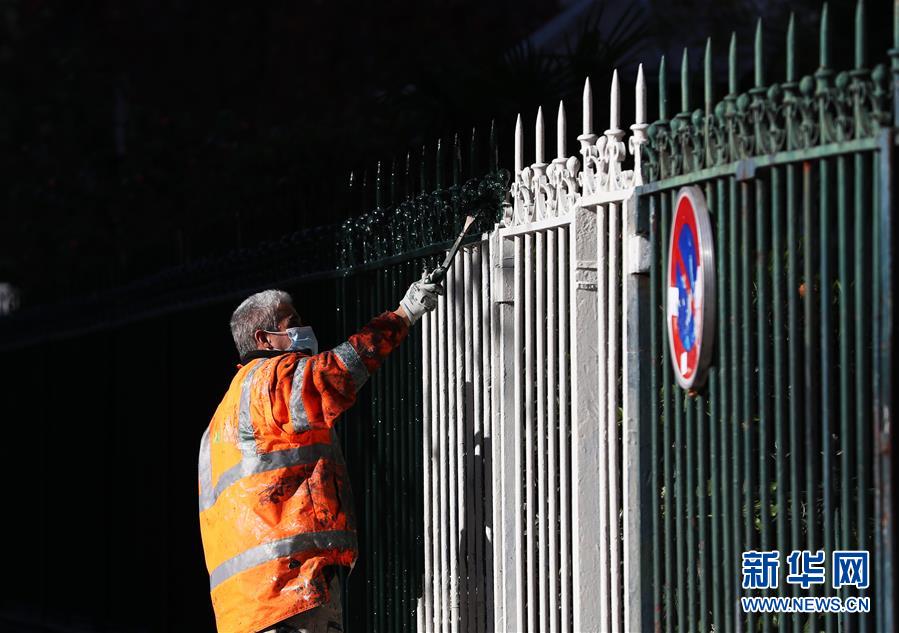 11月9日,一名油漆工在法国巴黎街头工作。 法国国民议会7日投票通过了延长“卫生紧急状态”的法案,“卫生紧急状态”将延长至2021年2月16日。 新华社记者 高静 摄