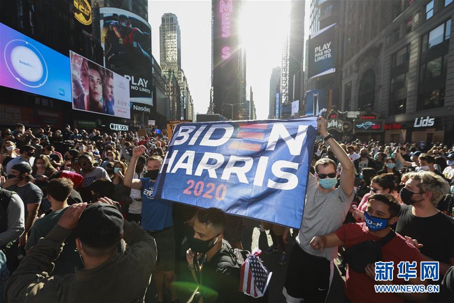 11月7日,人们聚集在美国纽约时报广场。 据美国媒体7日测算,民主党总统候选人、前副总统拜登在2020年美国总统选举中已获得超过270张选举人票。共和党总统候选人、现任总统特朗普随后表示,此次选举远未结束。针对选情最新变化,美国多地有拜登的支持者上街庆祝,也有特朗普的支持者上街抗议。 新华社记者 王迎 摄