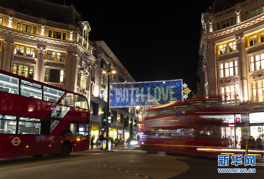 11月3日,车辆行人在英国伦敦牛津街点亮的节日彩灯下穿行。 英国伦敦牛津街2日点亮一年一度的圣诞节日彩灯,今年的主题是号召人们团结抗疫,并向抗疫英雄致敬。 新华社记者 韩岩 摄