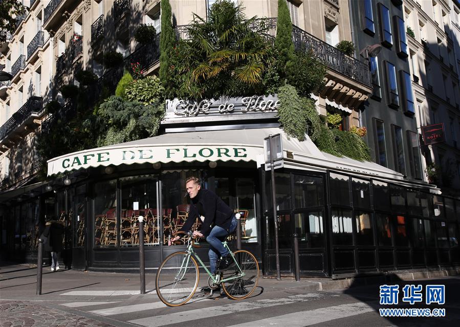 11月9日,在法国巴黎,一名男子骑车经过停业的花神咖啡馆。 法国国民议会7日投票通过了延长“卫生紧急状态”的法案,“卫生紧急状态”将延长至2021年2月16日。 新华社记者 高静 摄