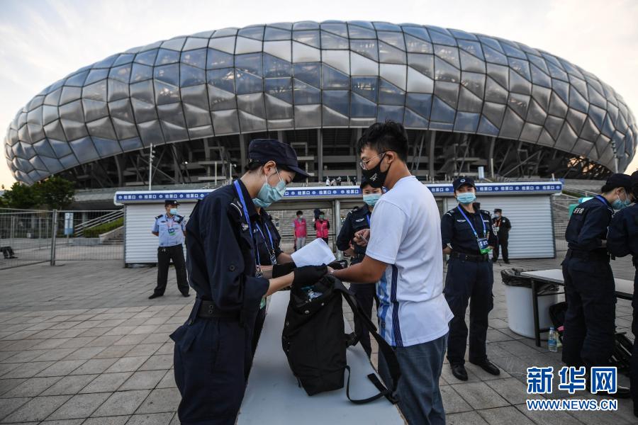 图为9月4日,一名球迷在大连体育中心体育场外接受安检。