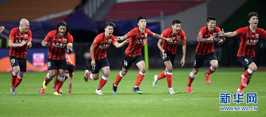图为10月23日,上海上港队球员在点球大战后庆祝胜利。