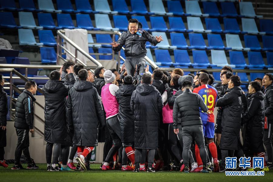 图为11月2日,青岛黄海青港队主教练吴金贵(上)在保级成功后与球队成员庆祝。