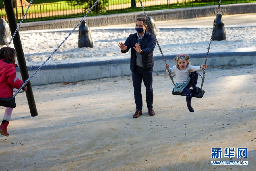 11月18日,在比利时布鲁塞尔,一名男子陪孩子荡秋千。