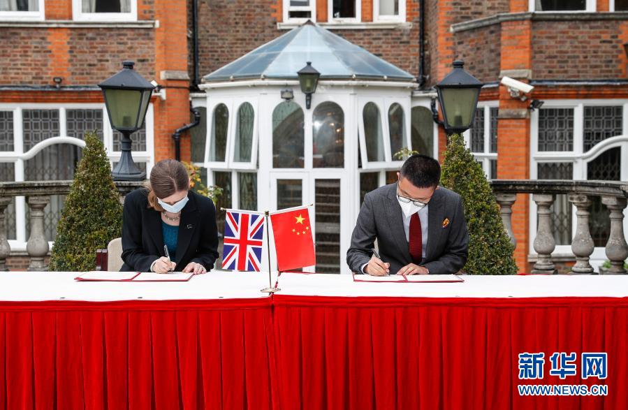 10月16日,在英国伦敦,代表中国国家文物局的中国驻英国大使馆文化处一秘于果(右)和代表英国大都会警察局的探员苏菲·海斯签署文物接收确认书。