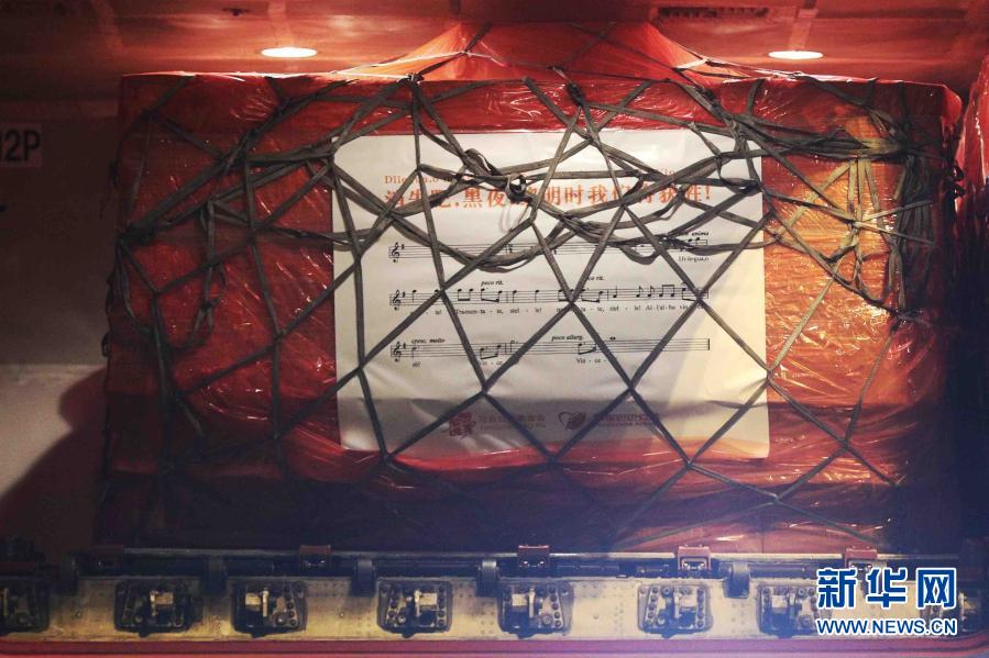 2020年3月13日,中国医疗物资在比利时列日机场等待卸货。物资外包装上写着著名歌剧《图兰朵》中一段咏叹调的歌词和曲谱“消失吧,黑夜!黎明时我们将获胜!” 这批医疗物资用于援助欧洲国家抗击新冠肺炎疫情。新华社记者 郑焕松 摄 |