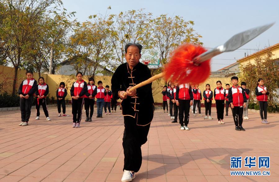 11月19日,在河北省沧州市沧县张官屯乡邱庄子小学,武师邓之贵(前)演示武术器械。