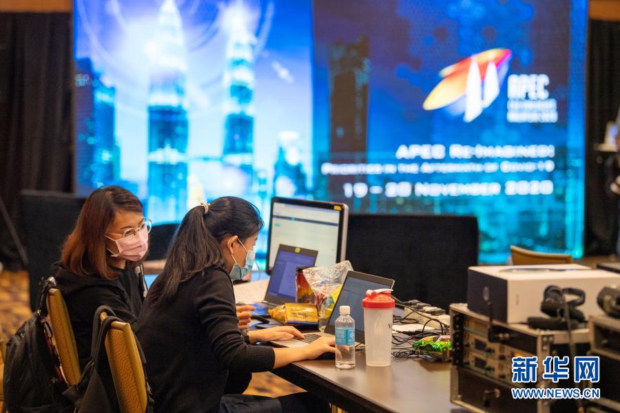 11月18日,在马来西亚吉隆坡会议中心,工作人员在亚太经合组织工商领导人对话会指挥中心忙碌。 2020年亚太经合组织(APEC)工商领导人对话会19日以线上形式举行,对话会指挥中心发挥了技术保障的“中枢”作用,确保了线上对话会顺利举行。马来西亚是2020年APEC会议东道主。 新华社记者 朱炜 摄