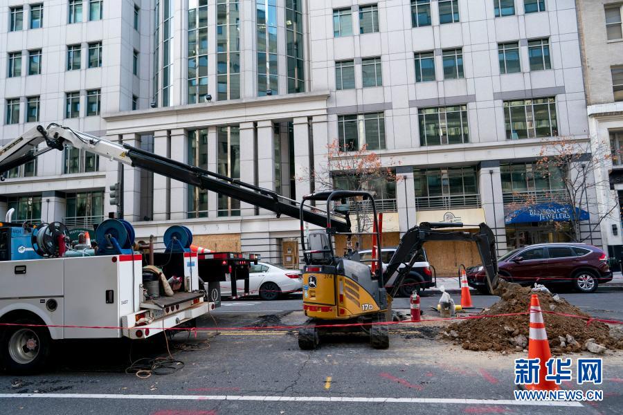 11月19日,在美国华盛顿,一名打电话的行人经过用木板加固门窗的办公楼。新华社记者 刘杰 摄