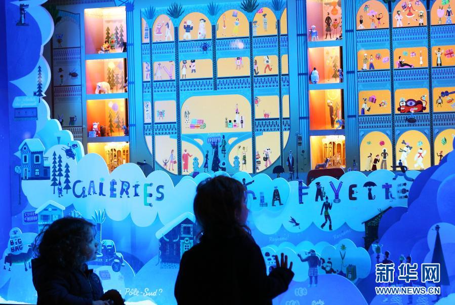 11月22日,孩子们在法国巴黎老佛爷百货商店的圣诞橱窗前驻足欣赏。新华社记者 高静 摄