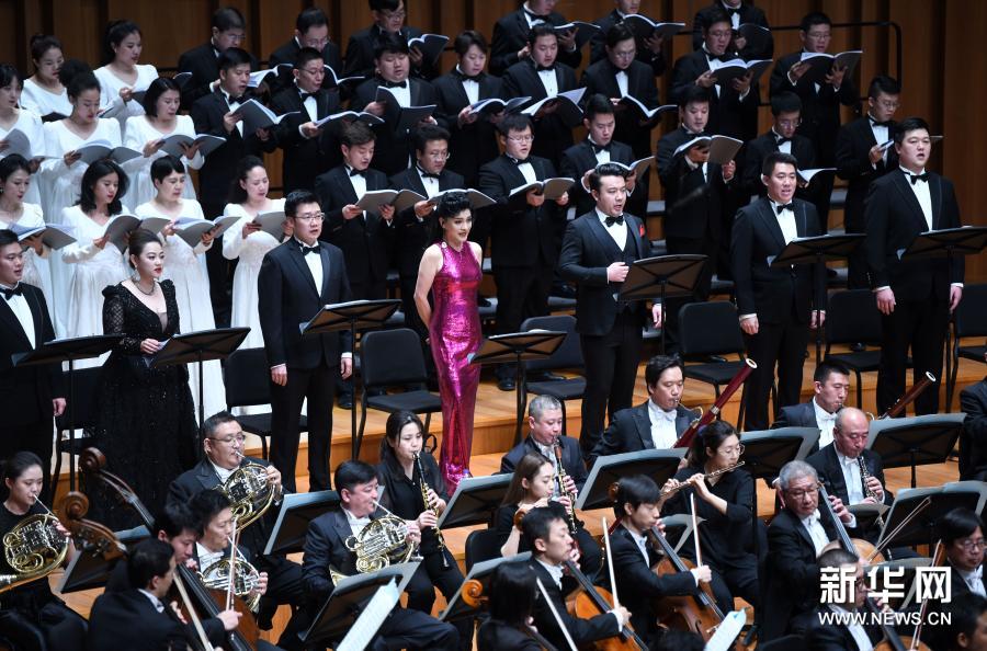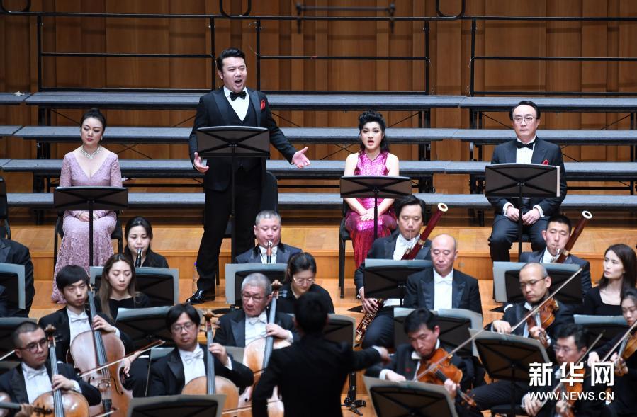 11月24日,男高音歌唱家张龙(后左二)、女高音歌唱家么红(后右二)、男中音歌唱家刘嵩虎(后右一)等在音乐会版歌剧《茶花女》上。当日,作为中国交响乐团2020-2021音乐季剧目之一,音乐会版歌剧《茶花女》在北京国家大剧院上演。新华社记者 金良快 摄